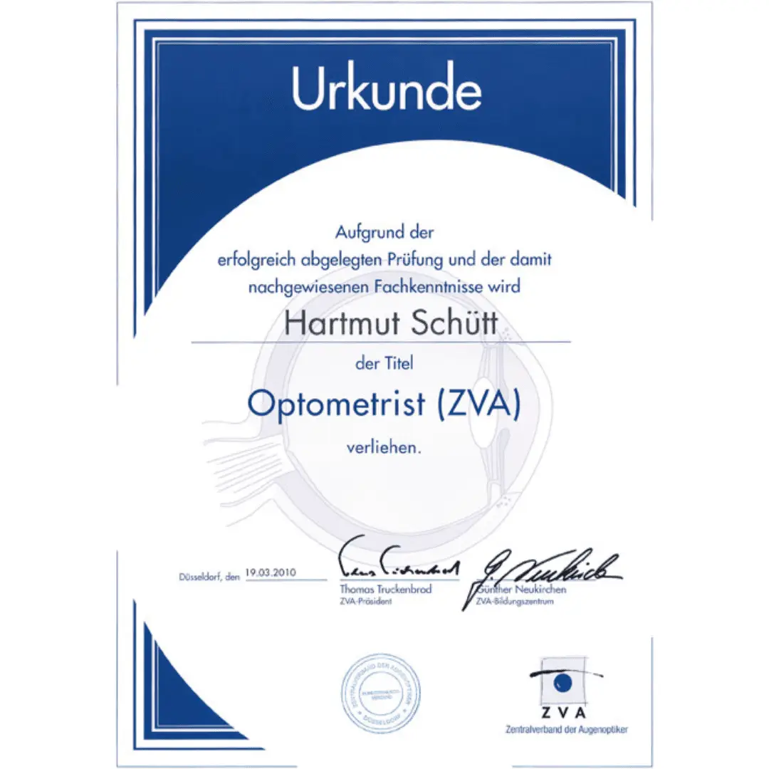 März 2010: Hartmut Schütt wird einer der ersten 30 Optometristen (ZVA) in Deutschland – und der erste Optometrist (ZVA) in Ludwigsburg.