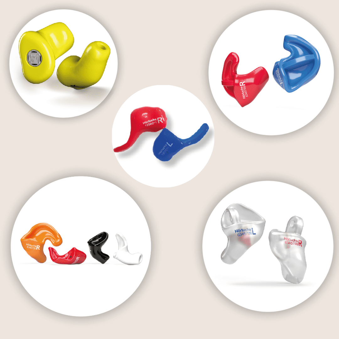 Statt herkömmlicher Kopfhörer empfehlen wir bei SCHÜTT Hörakustik in Ludwigsburg den Einsatz von maßgefertigtem Gehörschutz. Hier sind einige unserer spezialisierten Lösungen: