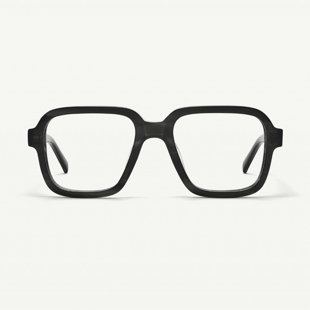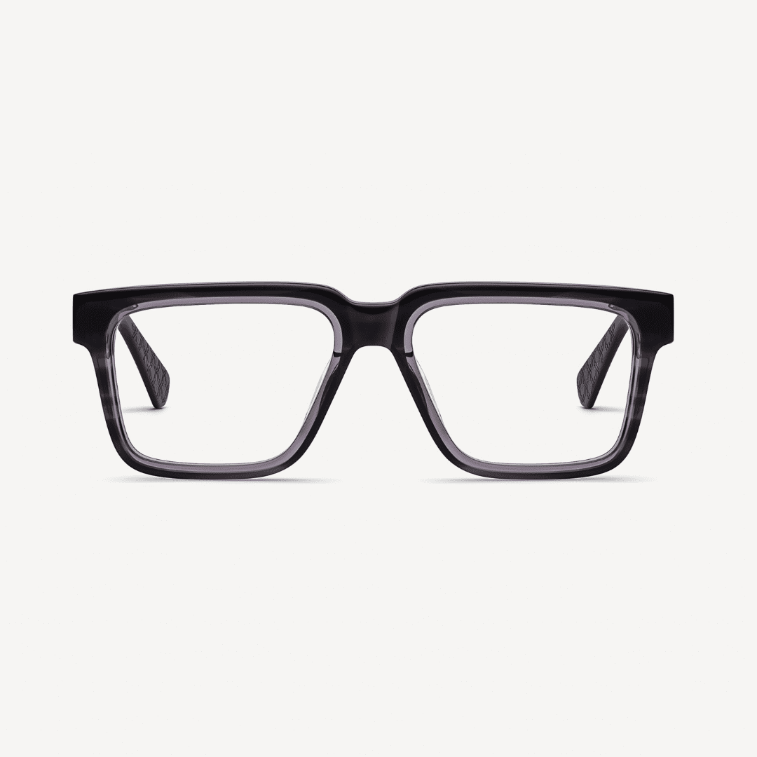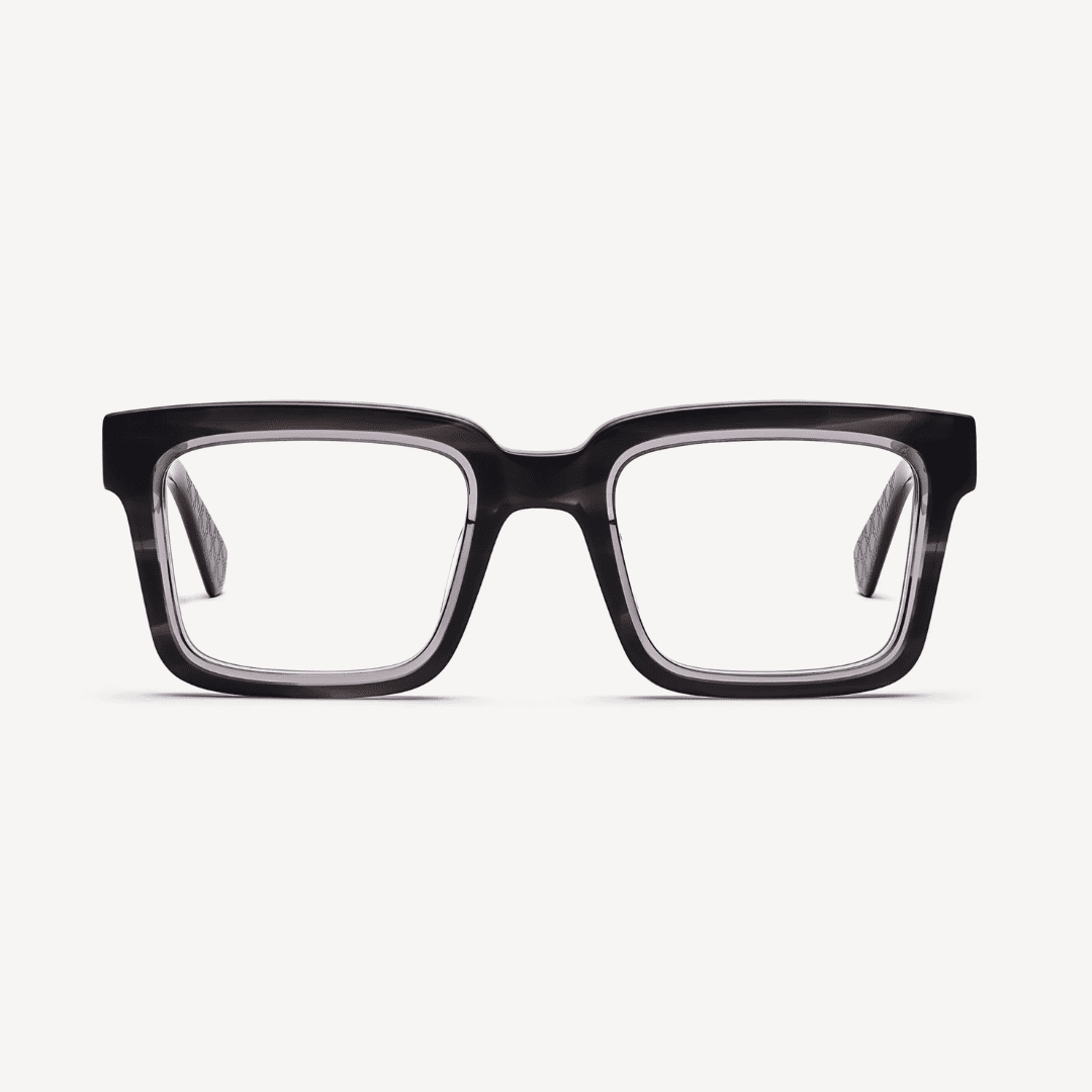 Die Nirvarn Javan Milan 02 ist eine elegante, rechteckige Brille aus feinstem italienischem Acetat – klar, gradlinig, stilvoll.